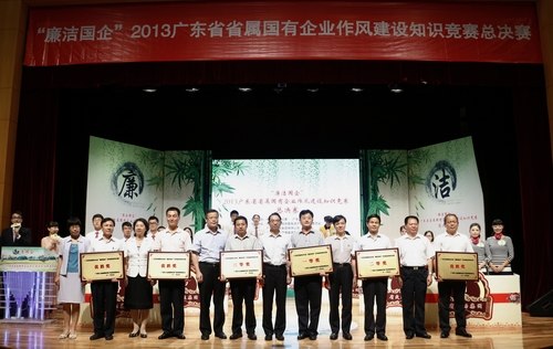 9月25日,省国资委2013年“廉洁国企”广东省省属企业作风建设知识竞赛决赛在广州市二沙岛星海音乐厅举行。省属企业经过初赛选拔的6支代表队参加了这次决赛。整个赛事气氛活跃,选手竞争激烈,观众互动踊跃。各企业的纪委书记和纪检监察负责人,部分企业董事长、总经理和职工,以及省国资委机关干部参加了这次活动。经过三轮答题环节的激烈较量,最终省水电集团、省机场管理集团、省交通集团胜出,分获决赛前三名。省粤电集团等12家省属企业荣获“优秀组织奖”。